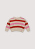 One of our best sellers, the Leto sweater, with colorful stripes and ribbed knit. It has ribbed neckline, cuffs, and hem, and shoulder opening with wooden buttons. 100% Organic Cotton.