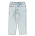 Unisex washed denim trousers with adjustable waist. Detailed with purple logo embroidery in one back pocket. 100% Cotton.