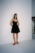 Hera Woman Short Dress in 100% linen, available in three colors: caviar, macadamia, and palm. Square neckline, straps with fasteners, and a short skirt with volume.